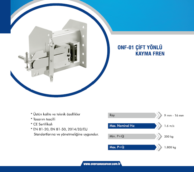 Çift Yönlü asansör freni, asansör kabininin kontrollü acil durdurulmasını sağlayan elektromanyetik güvenlik frenidir. Manyetik bobinin enerjisiz kalmasıyla birlikte yay basıncı altında fren pabuçlarını mekanik olarak kapatır ve halat çekiş kasnağını sabitler. Böylece enerji kesintisi, kumanda kartı komutu veya güvenlik hattı açılması gibi her durumda kabin hızla ve kontrol edilebilir şekilde durdurulur. Gövde yapısı, çekiş makinesinin hedeflenen tork kapasitesine uygun basınç dağılımı sağlar ve aşınmaya karşı dengeli temas yüzeyi sunar. Fren balataları yüksek sürtünme katsayısına sahip, ısıl dayanıklı kompozit malzemeden üretilmiştir; yoğun trafikli uygulamalarda dahi istikrarlı kavrama performansı verir. Elektromanyetik bobin, standart kumanda kartı çıkış rölesiyle sürülebilecek DC beslemeye uygun şekilde sarılmıştır; tepki süresi kısa, çekme akımı düşüktür. Gövde CE uygunluk işaretini taşıyan test paketi ile birlikte sevk edilir ve TS EN 81-20/50 normlarında tanımlanan tutma ve frenleme testleri için uygun referans değerlerine sahiptir. Ürün, asansorfabrikasi.com teknik ekibinin projeye özel uyumluluk kontrolünden geçirilerek tedarik edilir.