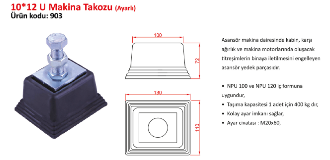 Asansör takozu, makine motor grubunun veya kabin alın çerçevesinin asansör şasisine yalıtılmış biçimde oturmasını sağlayan titreşim sönümleyici kauçuk/metal kompozit elemandır. Yüksek yoğunluklu kauçuk gövde; içine vulkanize edilmiş metal çekirdek ve montaj cıvatası ile birlikte hareket titreşimlerini kabin yapısına iletmeden emerek soğurur. Bu sayede bina içindeki gürültü seviyesi belirgin ölçüde düşer ve mekanik bağlantı noktalarının yorulma ömrü uzar. U, L ve M10 civatalı varyantlar; makine dairesi yerleşimine, kabin alın profili geometrisine veya kabin zemin sabitlemesine göre farklı kuvvet yönlerinde titreşim emilimi sağlayacak biçimde boyutlandırılmıştır. Montaj cıvatası, yerinde sabitlenecek şekilde önceden vulkanize edildiğinden saha kurulumunda ek yapıştırma veya bağlantı elemanı gerektirmez. Kauçuk karışımı; yağ, gres ve makine dairesi sıcaklığına karşı dayanıklı olacak biçimde formüle edilmiş olup zamanla sertleşme ve çatlama direnci gösterir. Ürün, asansorfabrikasi.com üzerinden proje yük sınıfına ve cıvata boyutuna göre uygun varyantta sevk edilir.