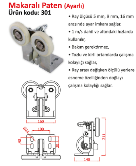Asansör kabin pateni makaralı yapıda, kabinin kılavuz raylar üzerinde sürtünmesiz biçimde hareket etmesini sağlayan taşıyıcı makara grubudur. Paten iskeleti; kabin alt ve üst çerçevesine cıvata ile sabitlenen sac/dökme metal gövdeden, rayın iki yanak yüzeyine temas eden iki yatay makaradan ve ray alın yüzeyini önden tutan bir tutuş makarasından oluşur. Makaralar; poliamid veya yüksek yoğunluklu kompozit malzemeden ve kalıcı greslenmiş bilyalı yataklarla üretilir; bu sayede hareket sırasında metal-metal sürtünmesi oluşmaz. Paten; sabit varyantta mekanik ayarı fabrika hizalı olarak sevk edilirken ayarlı varyantta ray yüzeyine temas yayının kuvveti saha montajı sonrası bir ayar vidasıyla hassasiyetle ayarlanabilir. Ayarlı paten, ray profilinde gözle görülebilir düzlem sapmalarının olduğu revizyon projelerinde kullanıcı konforunu belirgin biçimde artırır. Makaralı patenler; paten kayıcı tipine göre daha yüksek hızlı asansörlerde tercih edilir ve düzgün temas sayesinde kabin içi yatay titreşimleri minimum düzeye indirir. Ürün, asansorfabrikasi.com ekibi tarafından ray profili ve kabin ağırlığına uygun varyantta sevk edilir.