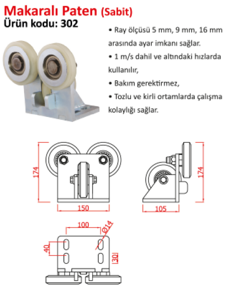 Asansör kabin pateni makaralı yapıda, kabinin kılavuz raylar üzerinde sürtünmesiz biçimde hareket etmesini sağlayan taşıyıcı makara grubudur. Paten iskeleti; kabin alt ve üst çerçevesine cıvata ile sabitlenen sac/dökme metal gövdeden, rayın iki yanak yüzeyine temas eden iki yatay makaradan ve ray alın yüzeyini önden tutan bir tutuş makarasından oluşur. Makaralar; poliamid veya yüksek yoğunluklu kompozit malzemeden ve kalıcı greslenmiş bilyalı yataklarla üretilir; bu sayede hareket sırasında metal-metal sürtünmesi oluşmaz. Paten; sabit varyantta mekanik ayarı fabrika hizalı olarak sevk edilirken ayarlı varyantta ray yüzeyine temas yayının kuvveti saha montajı sonrası bir ayar vidasıyla hassasiyetle ayarlanabilir. Ayarlı paten, ray profilinde gözle görülebilir düzlem sapmalarının olduğu revizyon projelerinde kullanıcı konforunu belirgin biçimde artırır. Makaralı patenler; paten kayıcı tipine göre daha yüksek hızlı asansörlerde tercih edilir ve düzgün temas sayesinde kabin içi yatay titreşimleri minimum düzeye indirir. Ürün, asansorfabrikasi.com ekibi tarafından ray profili ve kabin ağırlığına uygun varyantta sevk edilir.