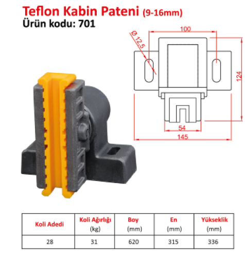 Teflon 9-16 mm asansör kabin pateni, kabin iskeletinin kılavuz ray üzerinde düşük sürtünmeli kılavuzlanmasını sağlayan teflon (PTFE) yataklı kılavuzlama elemanıdır.