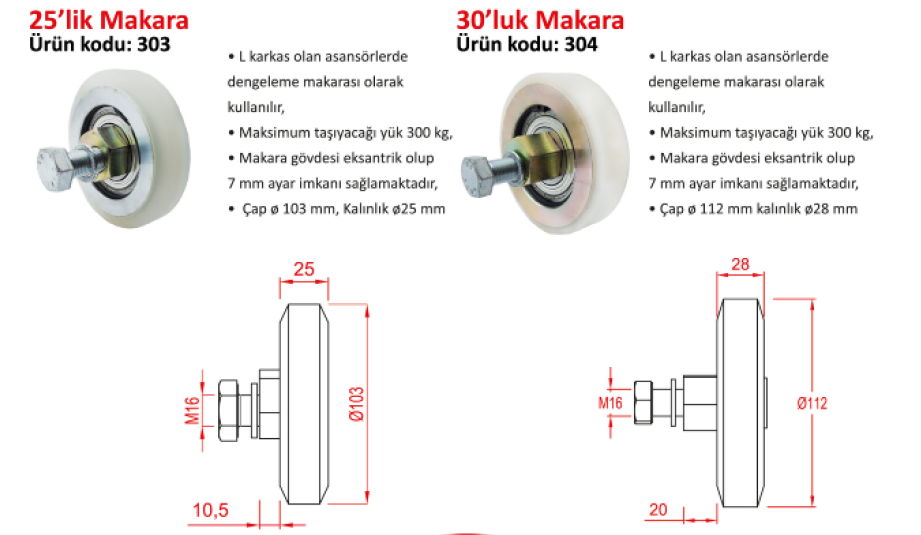 30'luk çapında asansör karkas makarası, kat ve kabin kapısı iskeletinde hareket eden kapak kanatlarının sürgülü hareketini destekleyen yataklı makaradır.