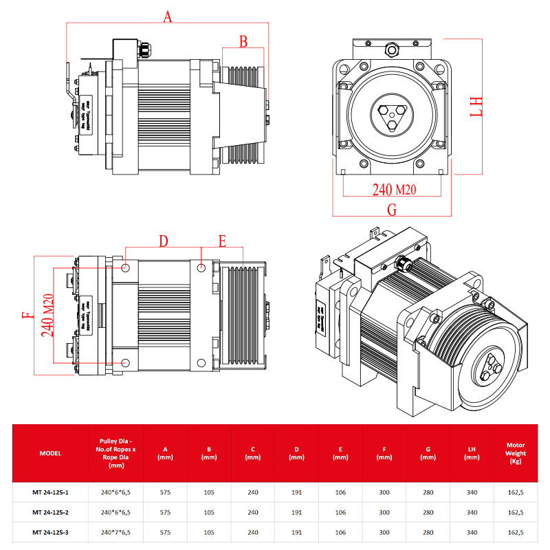 Kompakt tasarım sayesinde makine daireli ve dairesiz sistemlerde kullanılma imkanı sağlar. Maksimum seyir konforu ve asansör içerisinde minimum gürültü seviyesi sağlanmaktadır. Motorlarda geri besleme elemanı olarak Fenac ( Sin-Cos) enkoder isteğe göre Heidenhain (Endat) Kullanılmaktadır. Motorlarda Mayr marka elektromanyetik fren kullanılmaktadır. Metroplast, motor ölçülerinde ve tasarımında haber vermeden değişiklik yapma hakkına sahiptir. Askı Tipi 2 : 1 #top #wrap_all .avia-button.av-lj2lvfxm-bd51017af0ee6d70dae8b81b23ed338e{ margin-bottom:5px; margin-right:5px; } Mayr Uygunluk Belgesi Motor Type Car Speed(m/s) Power(Kw) Capacity (Kg) Pulley Dia –No.of Ropes x Rope Dia(mm) Rev (rpm) STATİC LOAD STATİK YÜK (kg) Current(A) Torque (Nm) Brake Torque(Nm) Polar Frequency(Hz) Travel Height(m) SUSPENSİON TYPEASKI TİPİ Motor Weight (Kg) MT 24-125-1 1,00 4,6 630 Ø240x6x6,5mm 160 5000 12 275 2*360 20 Pole26,6 Hz 45 2:1 162,5 MT 24-125-2 1,60 7,3 630 Ø240x6x6,5mm 255 5000 17 275 2*360 20 Pole42,5 Hz 45 2:1 162,5 MT 24-125-3 1,00 5,4 800 Ø240x7x6,5mm 160 5000 14,5 330 2*360 20 Pole26,6 Hz 21 2:1 162,5