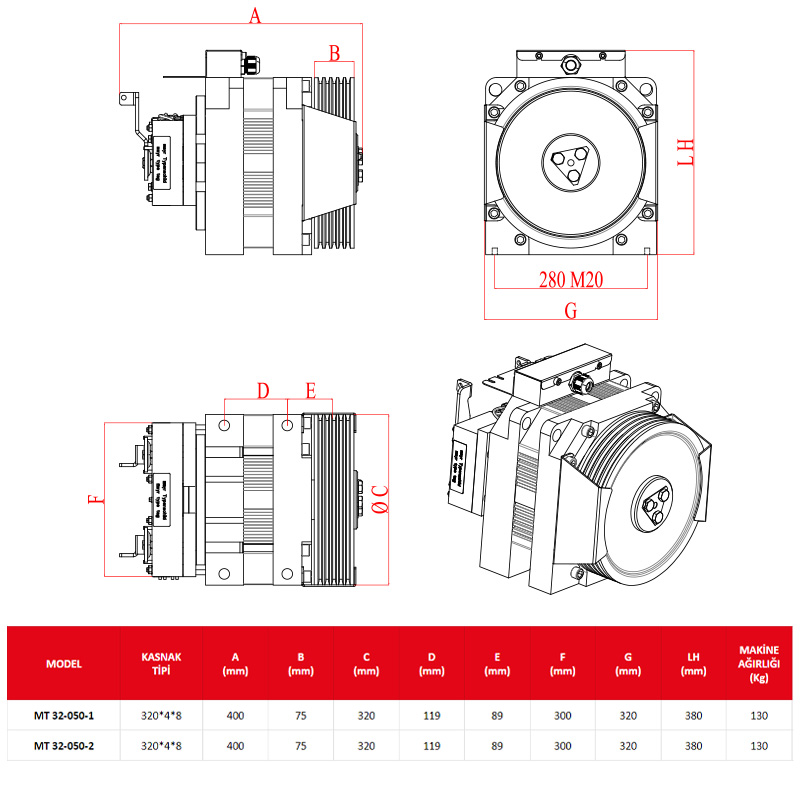 Metroplast asansör dişlisiz motorları kompakt tasarım sayesinde makine daireli ve dairesiz projelerde uygulama avantajı sağlar. Metroplast dişlisiz makinaları enerji verimliliği, sessizlik ve maksimum konforla çalışır. Asansör direktifi 2014/33 EU ve EN81-20, EN81-50 uygundur. Metroplast dişlisiz makinalarımızda Almanya üretimi MAYR marka elektro manyetik frenler kullanılarak maksimum asansör güvenliği seviyesi sağlanmıştır. Kat seviye belirlemesi ve konforlu seyir için müşteri talebine göre Fenac (Sin-Cos) veya Heidenhain (EnDat) enkoder kullanılabilir. Monoblok gövdede bulunan elektrik bağlantı kutusu ile montaj ve erişim kolaylığı sağlar. Ürünlerimiz kaliteli ve sağlam sandık ambalajlarla sevk edilir. #top #wrap_all .avia-button.av-lj2lvfxm-bd51017af0ee6d70dae8b81b23ed338e{ margin-bottom:5px; margin-right:5px; } Mayr Uygunluk Belgesi MODEL HIZ (m/s) GÜÇ (KW) KAPASİTE (Kg) KASNAK ÖLÇÜLERİ (mm) DEVİR (RPM) AKIM (A) TORK (Nm) FREN TORKU (Nm) FREKANS (Hz) SEYİR MESAFESİ (m) MAKİNE AĞIRLIĞI (Kg) MT 32-050-1 1,00 2,2 320 Ø320x4x8mm 120 8,5 180 2*250 20 Pole 20 Hz 21 130 MT 24-075-2 1,00 3,3 480 Ø320x4x8mm 120 12,5 262 2*250 20 Pole 20 Hz 21 130