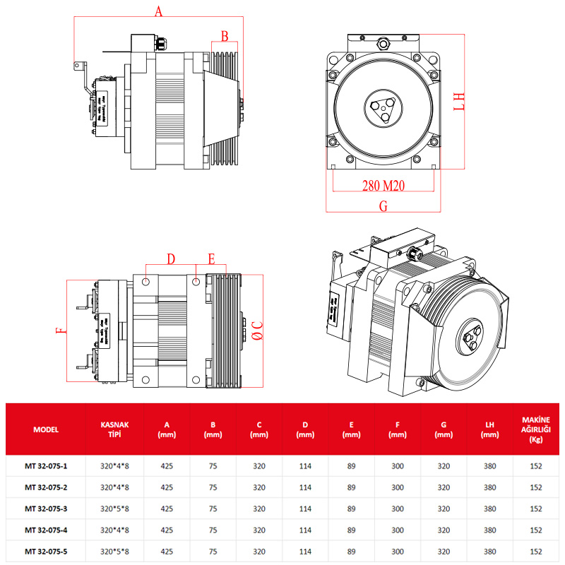 Metroplast asansör dişlisiz motorları kompakt tasarım sayesinde makine daireli ve dairesiz projelerde uygulama avantajı sağlar. Metroplast dişlisiz makinaları enerji verimliliği, sessizlik ve maksimum konforla çalışır. Asansör direktifi 2014/33 EU ve EN81-20, EN81-50 uygundur. Metroplast dişlisiz makinalarımızda Almanya üretimi MAYR marka elektro manyetik frenler kullanılarak maksimum asansör güvenliği seviyesi sağlanmıştır. Kat seviye belirlemesi ve konforlu seyir için müşteri talebine göre Fenac (Sin-Cos) veya Heidenhain (EnDat) enkoder kullanılabilir. Monoblok gövdede bulunan elektrik bağlantı kutusu ile montaj ve erişim kolaylığı sağlar. Ürünlerimiz kaliteli ve sağlam sandık ambalajlarla sevk edilir. #top #wrap_all .avia-button.av-lj2lvfxm-bd51017af0ee6d70dae8b81b23ed338e{ margin-bottom:5px; margin-right:5px; } Mayr Uygunluk Belgesi MODEL HIZ (m/s) GÜÇ (KW) KAPASİTE (Kg) KASNAK ÖLÇÜLERİ (mm) DEVİR (RPM) AKIM (A) TORK (Nm) FREN TORKU (Nm) KUTUP FREKANS (Hz) SEYİR MESAFESİ (m) MAKİNE AĞIRLIĞI (Kg) MT 32-075-1 1,00 2,2 320 Ø320x4x8mm 120 7,5 180 2*250 20 Pole 20 Hz 45 152 MT 32-075-2 1,00 3,3 480 Ø320x4x8mm 120 11,5 262 2*250 20 Pole 20 Hz 45 152 MT 32-075-3 1,00 4,3 630 Ø320x5x8mm 120 15 345 2*360 20 Pole 20 Hz 21 152 MT 32-075-4 1,60 5,2 480 Ø320x4x8mm 191 12,5 262 2*250 20 Pole 32 Hz 45 152 MT 32-075-5 1,60 6,9 630 Ø320x5x8mm 191 17 345 2*360 20 Pole 32 Hz 21 152